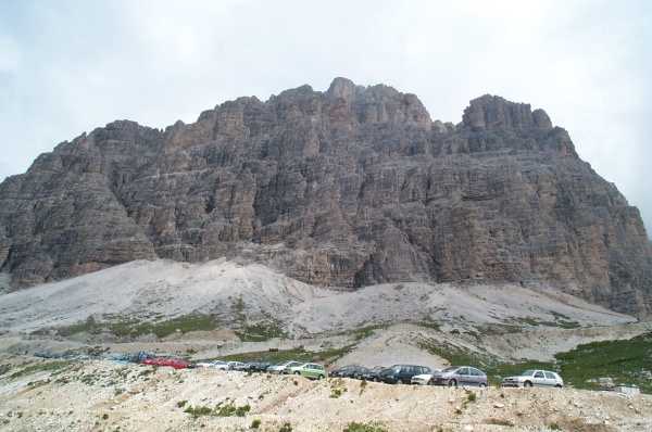 Vom herrlich gelegenen Misurinasee führt eine für den Kfz-Verkehr mautpflichtige Straße zum Rifugio Auronzo, direkt am Fuße der Drei Zinnen. Im Gegensatz zu den meist eher gemäßigten Steigungen in den Dolomiten, stellt diese Stichstraße eine gewaltige Rampe dar. Die ersten drei Kilometer sind noch relativ harmlos, doch anschließend geht es etwa vier Kilometer mit kontinuierlich um die 16% hinauf. Mit meiner damaligen Übersetzung von 42/23 ein ziemlicher Kraftakt. Doch die Schindere rentiert sich auf jeden Fall, denn zum einen erreicht man den höchsten asphaltierten Punkt der Dolomiten und zum anderen bietet sich von dort ein herrliches Panorama. Etwas getrübt wird der Spaß jedoch trotz horrender Mautgebühren durch einen Großparkplatz direkt am Refugio.