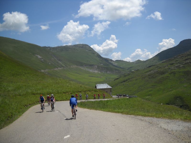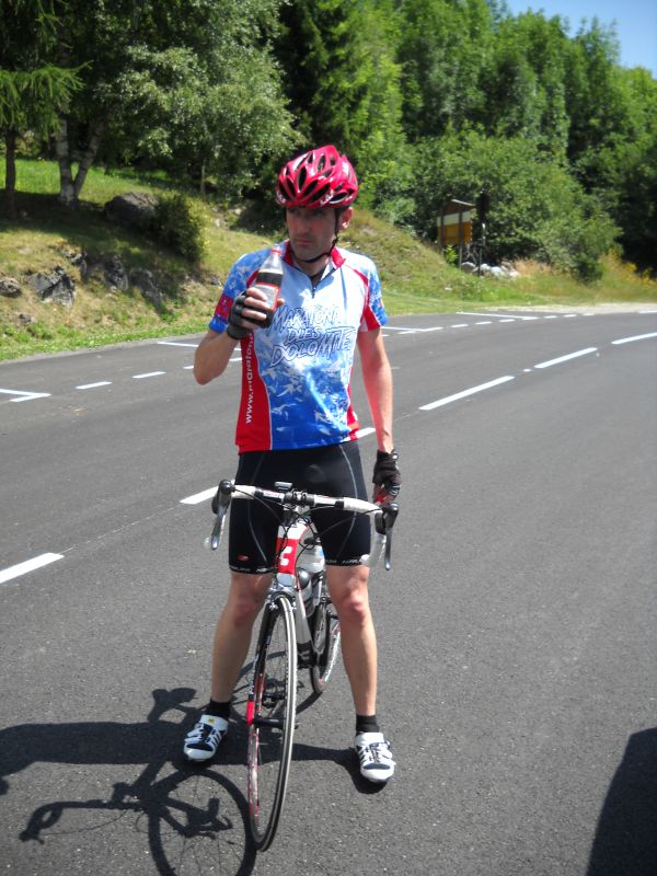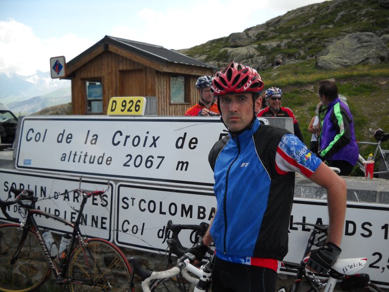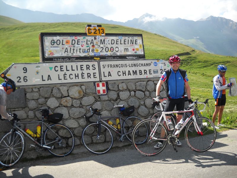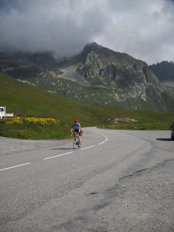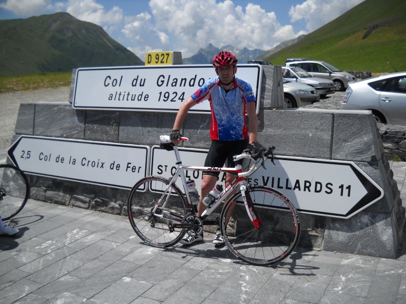 Im Tal in La Chambre nutzte ich nochmals die Gelegenheit, meine Energiereserven nachzufüllen, bevor im direkten Anschluss der zweite Gipfel der Ehrenkategorie — der Col du Glandon — auf dem Programm stand. Inzwischen war es über 30 Grad heiß und so waren die ersten Kilometer richtig hart, obwohl die richtig steilen Passagen erst noch folgen sollten. Glücklicherweise fand ich doch noch meinen Tritt (so ein Cola kann wahre Wunder bewirken) und kurbelte gleichmäßig nach oben. Auf einer Höhe von etwa 1200m verengte sich dann die Straße auf gut einspurig und ab da wurde es dann auch merklich steiler. Gut, dass auch dieses mal wieder einige Radler deutlich mehr zu kämpfen hatten als ich und ich mich somit geradezu von einem zum anderen hangeln konnte. Am Talschluss wurde es dann aber knüppeldick und bei Steigungen von deutlich über 10% musste ich zum ersten mal richtig ranklotzen. Die Passhöhe selbst gleicht einer Pilgerstätte für Rennradfahrer. Für ein obligatorisches Bild vor dem Passschild musste man sich regelrecht anstellen.