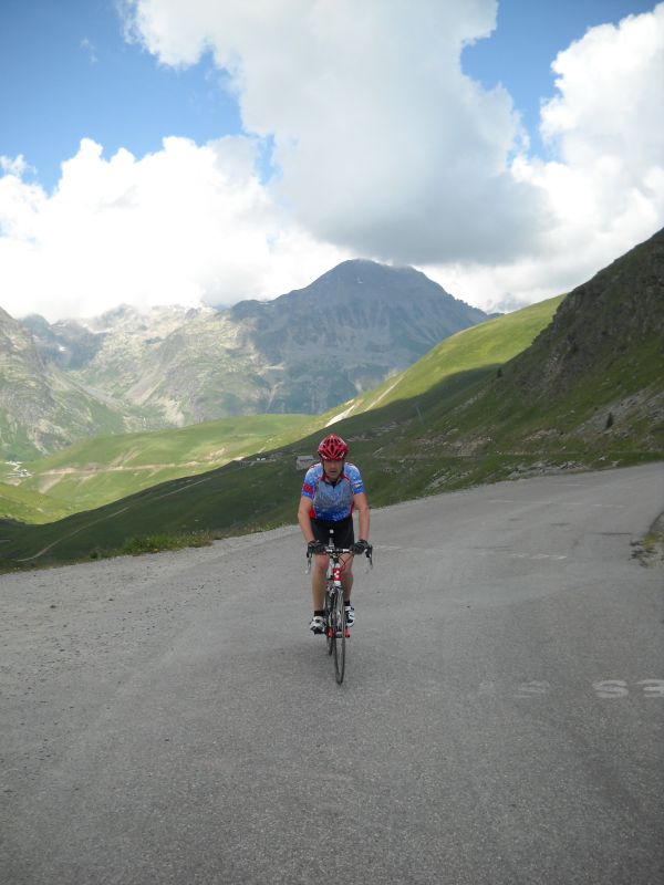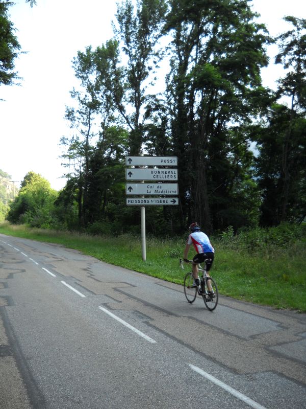 Die zweite Etappe war vor allem durch zwei Pässe der „Ehrenkategorie“ geprägt: dem Col de la Madeleine und dem Col du Glandon / Col de la Croix de Fer. Etappenstart war in La Lechere im Isere-Tal, wo wir auch übernachteten. Nach knapp fünf Kilometern einrollen ging’s auch schon in den ersten Anstieg — und das gleich volle Pulle mit Steigungen um die zehn Prozent. Trotz der schweren Tour am Vortag spürte ich aber, dass sich meine Beine gut erholt hatten und so fand ich schnell meinen Rhythmus. Die ersten knapp 10 Kilometer verliefen überwiegend im Wald, ab Celliers war jedoch die Sicht nicht mehr eingeschränkt und ich konnte die Landschaft in vollen Zügen genießen — wohl auch, weil meine Beine wie ein Uhrwerk kurbelten. Nach und nach überholte ich andere Radler, bis ich auf eine italienische Gruppe stieß, mit denen ich ins Gespräch kam. Die sind tags zuvor auch den Colombiere gefahren und haben dort doch tatsächlich Lance Armstrong getroffen. Auch ich hatte zuhause noch davon gelesen, dass der Amerikaner vor der Tour noch ein paar Alpenpässe besichtigen wollte. Einer der italienischen Fahrer hängte sich an mich ran, die anderen ließen leider schnell reißen. Bis zum letzten Steilstück konnten wir so nochmals richtig Tempo machen. Dieses musste ich dann allerdings wieder alleine in Angriff nehmen, da sich auch der übrig gebliebene Azzuri verabschiedete. Kurz gestärkt (mein Vater mir dem Begleitfahrzeug wartetet bereits oben), nahm ich sofort die Abfahrt Angriff. Außer, dass man diese recht zügig bewältigen konnte, ist mir nur noch die Retorten-Skistation Longchamp in Erinnerung. Typisch französisch, typisch hässlich ohne Rücksicht auf die Natur.