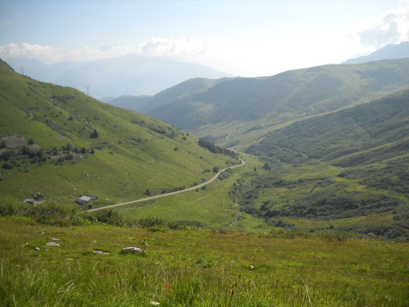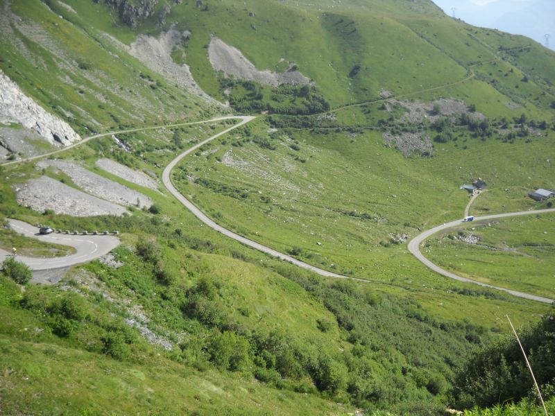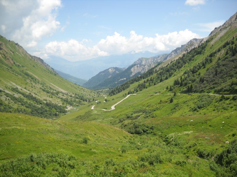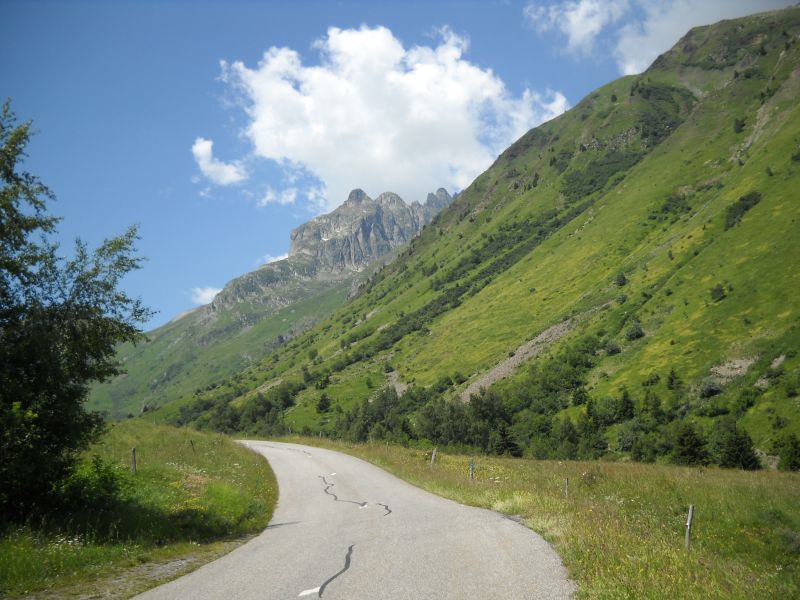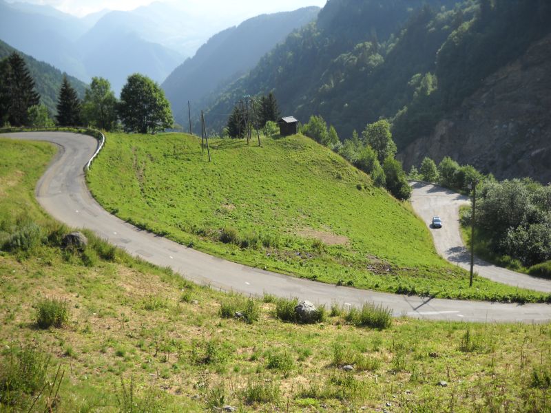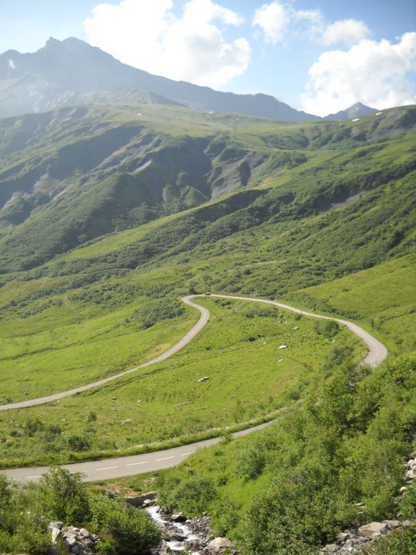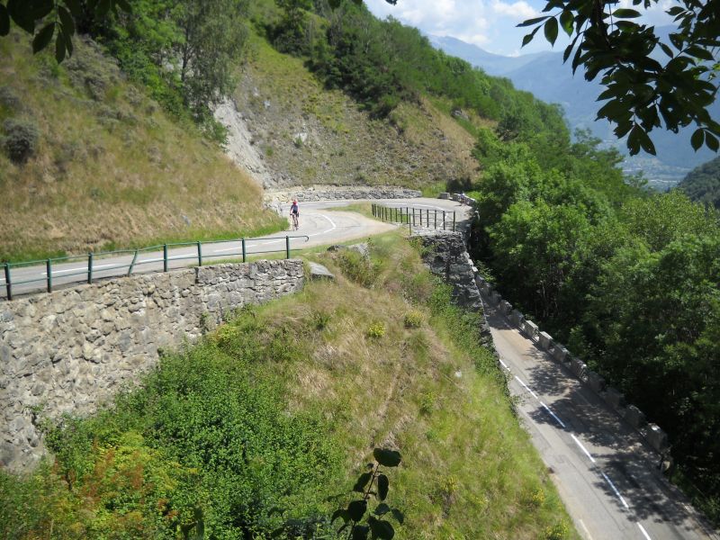 Als Abschluss dieser Etappe hatte ich mir noch einen kleinen etwas abseits gelegenen Pass ausgesucht. Etwa 15 Kilometer vor Saint-Jean-de-Maurienne, zweigt nach rechts ein kleines Sträßchen zum Col du Mollard ab. Ein richtiger Geheimtipp scheint dieser Pass allerdings auch nicht mehr zu sein, denn auch hier waren die typischen Anfeuerungsparolen der Tour de France auf die Straßen gepinselt. An jenem Tag hatte sich aber kaum jemand dorthin verirrt. Landschaftlich ist dieser kleine Anstieg durchaus empfehlenswert. Die Abfahrt nach Saint-Jean-de-Maurienne ist allerdings mit Vorsicht zu genießen. Steil, kehrenreich, und teilweise schon etwas aufgeweichter Teer. Sofort hatte ich das Bild vom ehemaligen spanischen Profi Belogi vor Augen, der als einer der Mitfavoriten der Tour in so einer aufgeweichten Spur fürchterlich stürzte. Mit entsprechend angepasster Fahrweise war die Abfahrt jedoch gut machbar und das Etappenziel unversehrt erreicht.