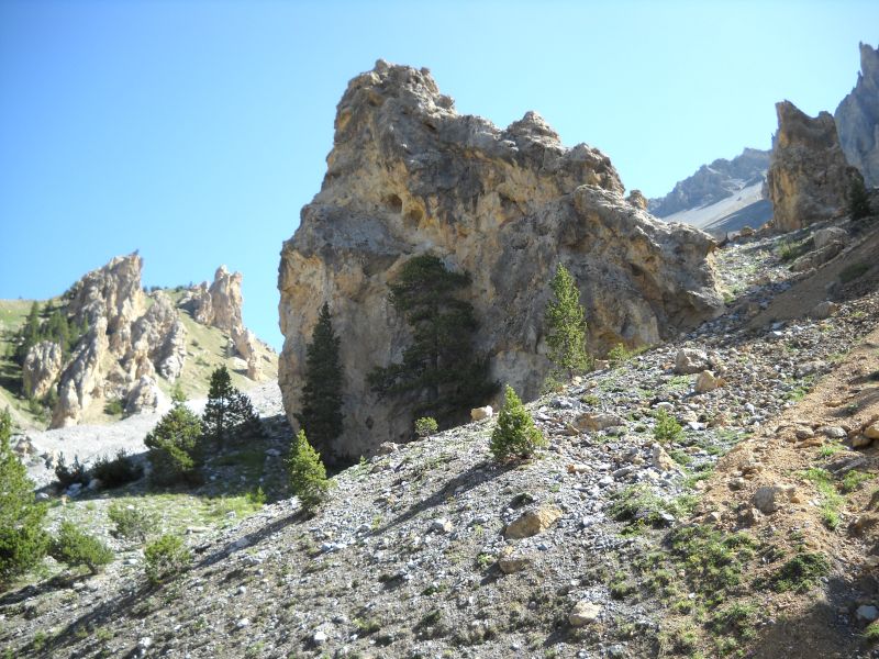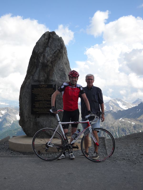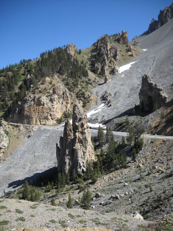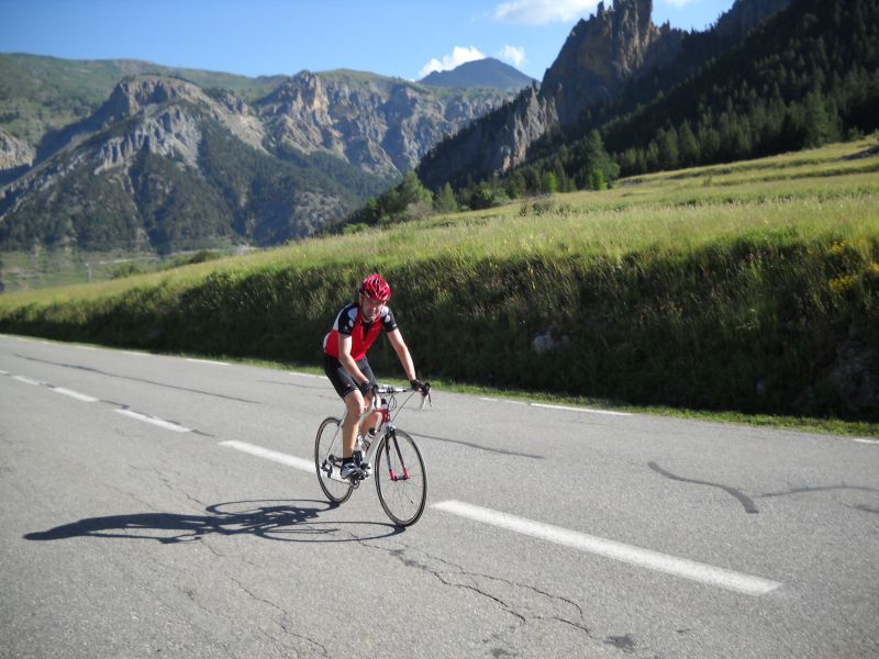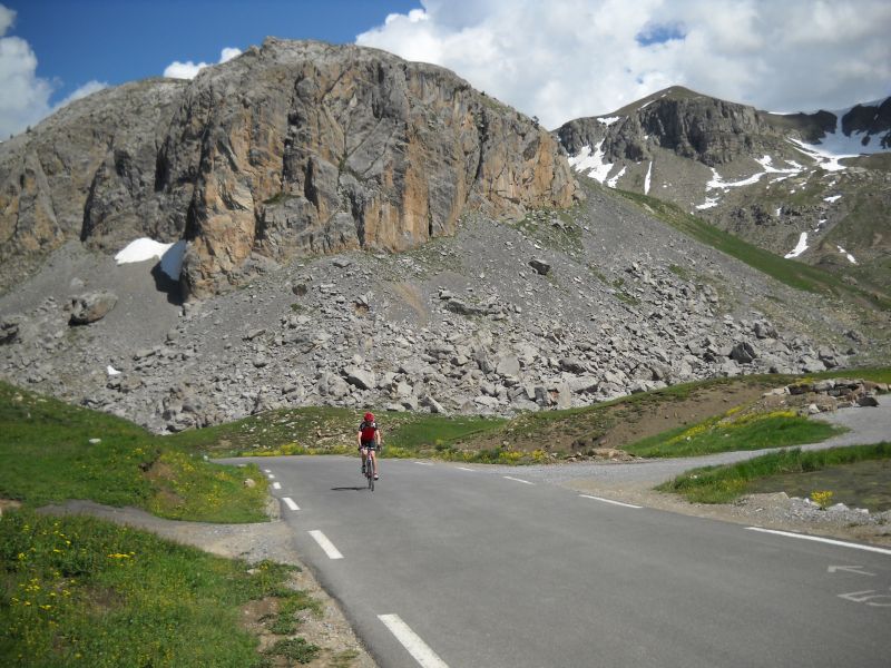 Wie bereits gewohnt, war beim Start in Briancon der Himmel wieder wolkenlos. Ideale Bedingungen also für die zu erwartenden landschaftlichen Höhepunkte. Beim Anstieg zum Col d’Izoard stand aber zunächst der sportliche Aspekt im Mittelpunkt. Ziemlich viele Radler waren bereits unterwegs und ich konnte einen nach dem anderen schlucken. Es schien so, als würde sich meine Form von Tag zu Tag noch verbessern. Der Col d’Izoard war wirklich ein sehr angenehm zu fahrender Pass. Zwar etwa 20km lang, aber nie wirklich steil. So zeigte mein Tacho auf der Passhöhe immerhin einen Schnitt von knapp über 16 km/h an. Casse Desserte, eine Art Steinwüste, folgte direkt nach der Passhöhe — einfach atemberaubend schön. Die Abfahrtsstrecke war gut ausgebaut, so dass wir zügig ins Tal nach Guillestre kamen.