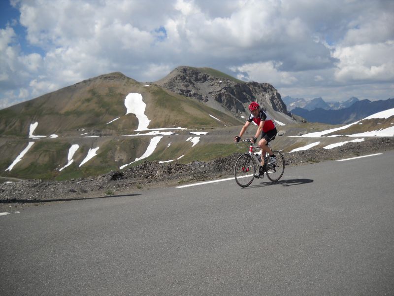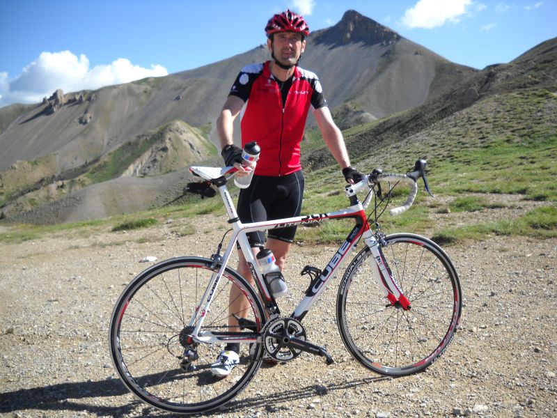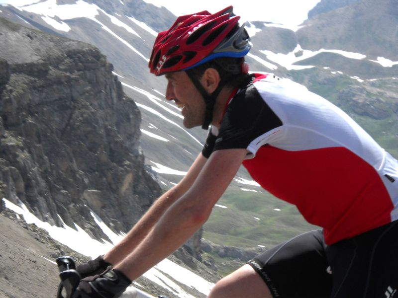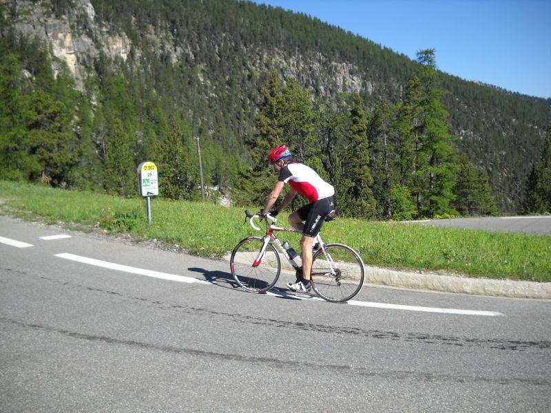 Nach ziemlich genau 100km und zwei ordentlichen Pässen hieß es nun nochmals 23km und etwa 1600 Höhenmeter bergauf. Im Vergleich zu den beiden ersten Anstiegen ließ ich es dieses Mal deutlich ruhiger angehen. Doch auch der Bonette war sehr gleichmäßig zu fahren mit Steigungen, die meistens um die sieben Prozent lagen. Ab einer Höhe von etwa 2000 Metern wurde es richtig hochalpin. Nur das Pfeifen der Murmeltiere „störte“ die absolute Ruhe. Erstaunlich dann die letzte Passage: fast eben führte die Straße in einer Höhe von 2700 Metern zum eigentlichen Pass. Eigentlich deshalb, da man von der Passhöhe noch eine Zusatzschleife drehen kann, die fast bis zum Gipfel führt und man schließlich einen der höchsten asphaltierten Punkte der Alpen erreicht (wer noch höher hinaus möchte, dem sei der megaschwere Anstieg zum Tiefenbachgletscher empfohlen). Pässe verbinden ja eigentlich zwei Täler über einen Bergeinschnitt. Hier hatte man den Eindruck, den höchsten Punkt der ganzen Gegend erreicht zu haben.