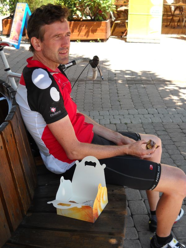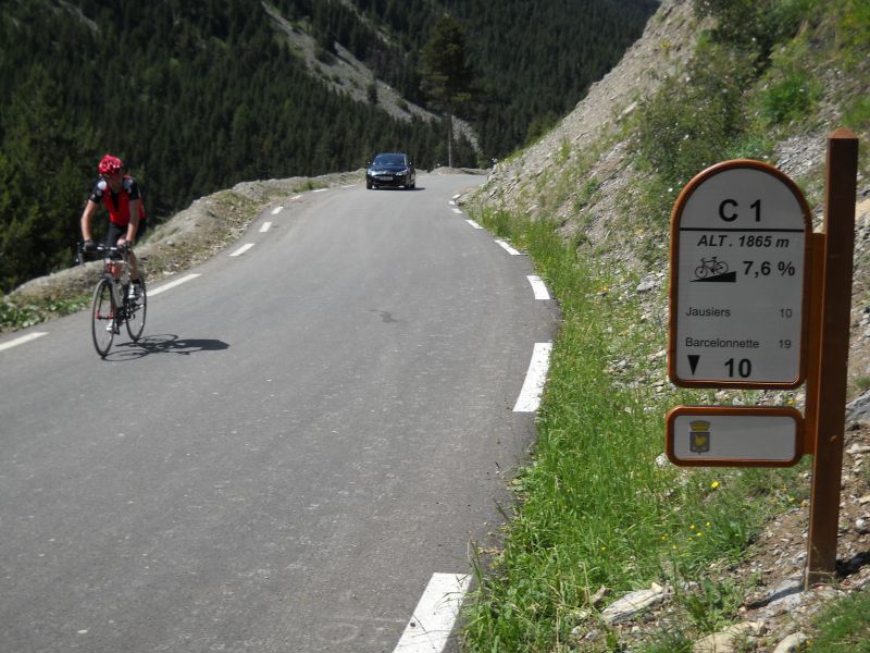Nach obligatorischer Stärkung mit ein paar süßen Gebäckteilen (die waren fast zu süß), folgte der zweite Anstieg zum Col de Vars. Da für diesen Tag ja nur diese beiden Pässe geplant waren, hab ich auch dort gut auf’s Pedal gedrückt und kam recht zügig voran. Vom Charakter her ähnelte dieser Pass dem ersten, wieder lang, aber moderate Steigungen. Nachdem es auf der Passhöhe erst kurz nach eins war, entschloss ich mich, den Col de la Bonette nicht erst am nächsten Tag zu fahren, sondern als krönenden Abschluss ans Ende dieses Tages zu hängen und somit die Königsetappe vorzuziehen. Dabei hätte uns eine Straßensperrung beinahe noch einen Strich durch die Rechnung gemacht. Barre! — Weiterfahrt erst in drei Stunden möglich. Nach kürzester Zeit fanden sich dort immer mehr Radfahrer ein, doch alles Diskutieren mit einem der Arbeiter half nichts. Frust machte sich bereits breit, als die Erlösung eintraf: einem Postauto wurde die Durchfahrt gewährt und mit diesem auch den übrigen Wartenden. Dem Bonette stand also nichts mehr im Wege.
