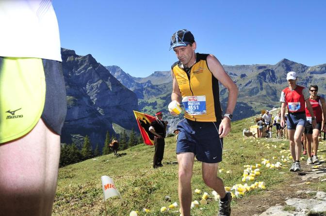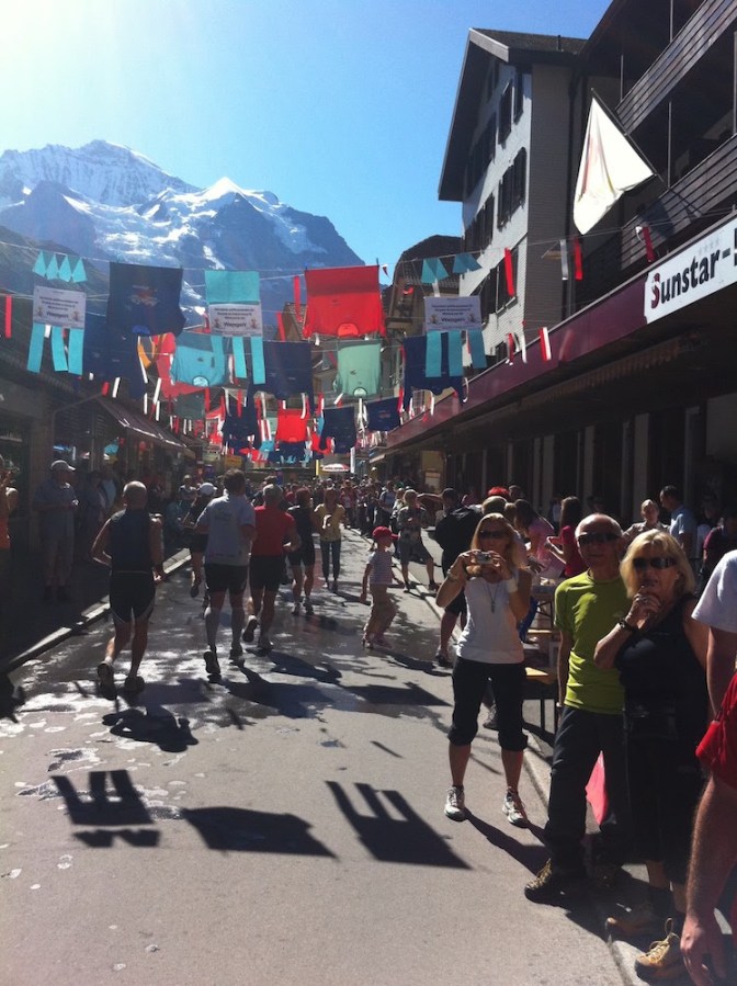 Unterbrochen von nur wenigen kurzen Anstiegen, folgte die erste Hälfte weitestgehend der Strecke der Jungfraubahn. Erster Höhepunkt war dann etwa bei Halbmarathondistanz in Lauterbrunnen erreicht. Bei bester Volksfeststimmung wurden wirklich alle Läufer enthusiastisch angefeuert. Dabei durfte man allerdings nicht vergessen, nochmals richtig Energie zu tanken, denn ab Kilometer 26 begann der Spaß so richtig. Nachdem bis dorthin gerade mal 250 Höhenmeter überwunden waren, mussten auf den folgenden 2,5 km 400 Höhenmeter bezwungen werden. Während die meisten hier nur noch mit mehr oder weniger schnellem Wandertempo vorankamen, hielt ich meinen Laufrhythmus und konnte so Platz um Platz gutmachen. In Wengen schnappte ich von einem Sprecher die ungefähre zwischenzeitliche Platzierung auf — 1025 — wow, da war mehr drin!