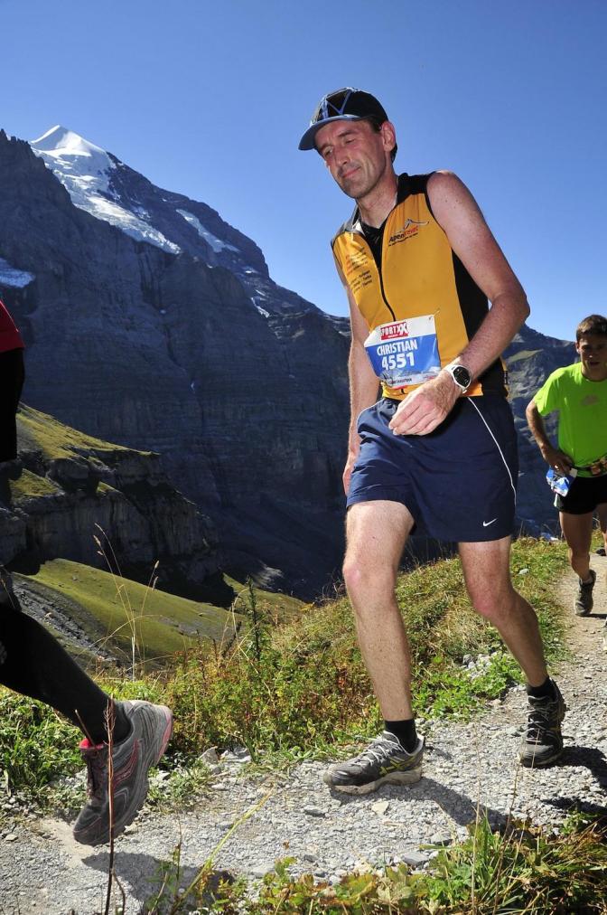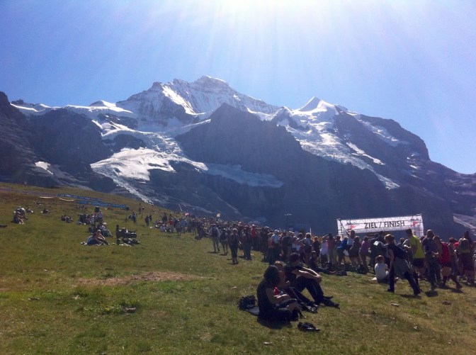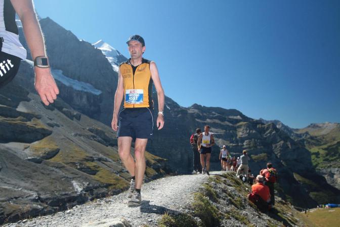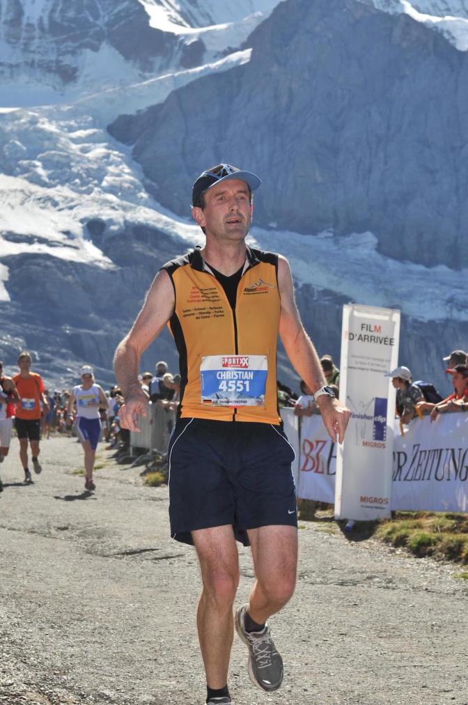 Richtig steil wurde dann nochmals der vorletzte Kilometer. Im Gänsemarsch führte die Strecke mangels Überholmöglichkeiten bis knapp an den Eigergletscher auf 2200m. Gemein ist der „Zielschuss“: über 100 Höhenmeter nochmals bergab. „Jetzt nur keinen Krampf“, dachte ich mir. In 4:39:50 überquerte ich mit unbeschreiblichen Emotionen die Ziellinie! Was für ein Tag: Traumwetter, Traumlandschaft und Traumergebnis!