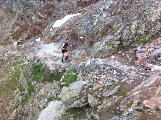 Am Hotel angekommen, mischten wir uns erst mal (zwangsweise) unter die Turnschuh- und Sandalentouristen. Während wir bereits über drei Stunden unterwegs waren, ließen sich diese bequem per Seilbahn vom Schnalstal aus hochgondeln. Unseren Spaß aber trübte dies keinesfalls. Nach kurzer Stärkung auf der Sonnenterasse (3100 m, über 20 Grad warm!) genossen wir auf dem Gipfel des Grawand (3151 m) unseren Exotenstatus als Trampelpfadläufer. Spätestens als wir nicht wieder zum Hotel zurückkehrten sondern dem ausgesetzten Abstieg über den Steig Richtung Südosten folgten, waren uns respektvolle Blicke der Sommerfrischler sicher!