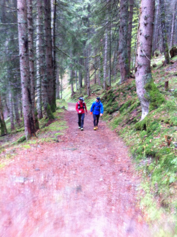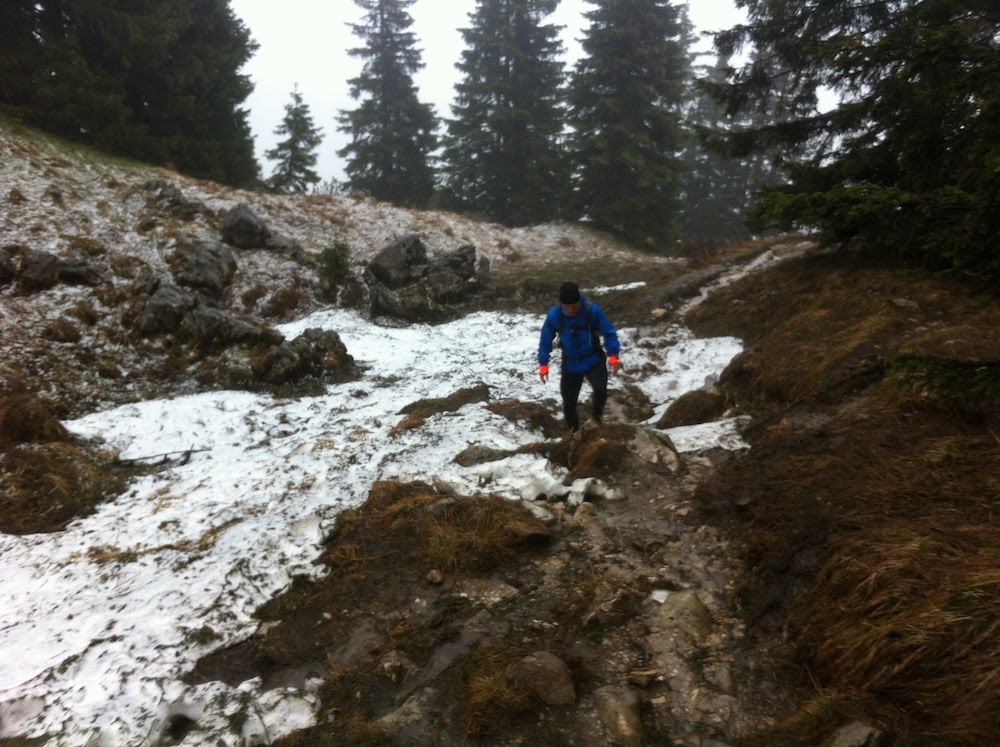 Es folgten weitere knapp 400 HM auf dem Forstweg vorbei am Pürschlinghaus zum Teufelstättkopf. Der Regen war inzwischen in Schnee übergegangen und reichlich „Schneereste“ verwandelten den Event nun in einen Orientierungslauf. Doch irgendwie schafften wir es immer wieder, den Weg zwischen den verschneiten Latschenkiefern zu finden. Bis kurz nach dem Dreisäulerkopf ging das nun so. Kurze laufbare Abschnitte wechselten mit Altschneefeldern, wo wir teilweise knietief einsanken. Dies kostete viel Zeit und noch mehr Kraft. Doch der Laune tat dies keinen Abbruch. Schließlich gehört ein bisschen Abenteuer einfach dazu!