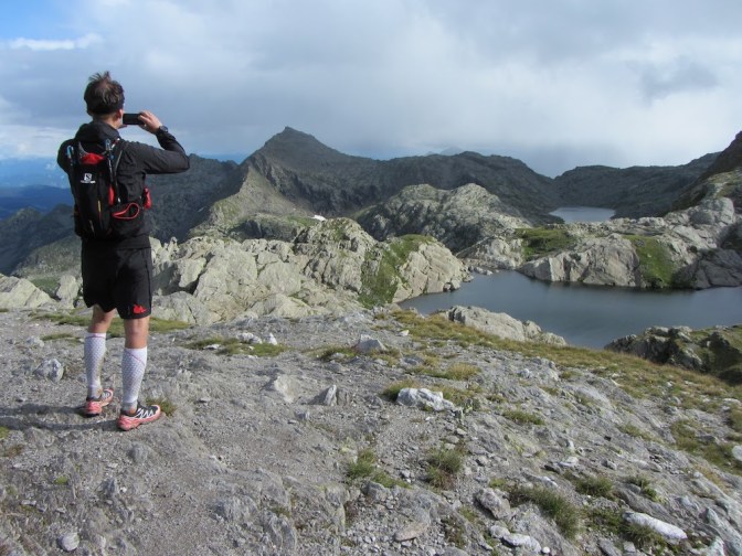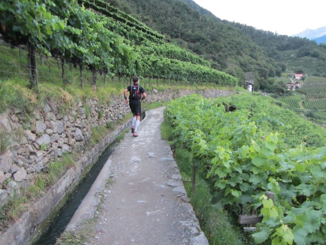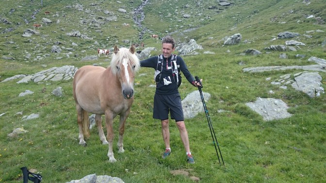 Doch bis zum nächsten Verpflegungspunkt in Pfelders fehlten immer noch knapp 1000 Höhenmeter. Irgendwann musste es doch mal richtig bergab gehen. Und es ging richtig bergab! Genauer gesagt 900 Hm auf einer Länge von gerade mal 3 Kilometern auf ganz fiesem Wiesentrail. Gerade mal fussbreit und dazu hohes Gras, so dass man nie genau wusste, ob man überhaupt vernünftig auftreten konnte. Nicht nur für die Oberschenkel sondern auch für den Kopf extrem fordernd!