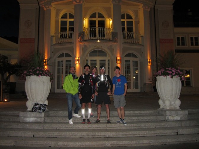 2000 Höhenmeter auf 10 Kilometer – und das nach 50 Kilometern! Puh, wem da nicht die Oberschenkel glühen! Das Ziel nun schon deutlich in Sichtweite, spulten wir die letzten sieben Kilometer auf den Waalwegen entlang Obstplantagen und Weinbergen ab. Mit letztem Restlicht erreichten wir schließlich nach 16 Stunden und 30 Minuten stilvoll auf der Passerpromenade das Meraner Kurhaus. Geschafft! Was für ein (Lauf-)Abenteuer! Die anderen waren inzwischen aus einer nahegelegenen Kneipe zu uns gestoßen. Ein Empfang wie bei einem Rennen, toll! Nun noch schnell ein paar Fotos am Kurhaus und ab in die nächste Pizzeria (auch wenn das für die anderen Gäste so rein geruchstechnisch nicht unbedingt so toll war