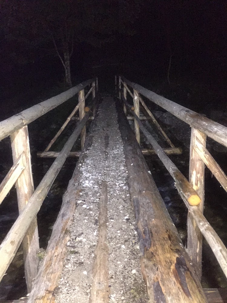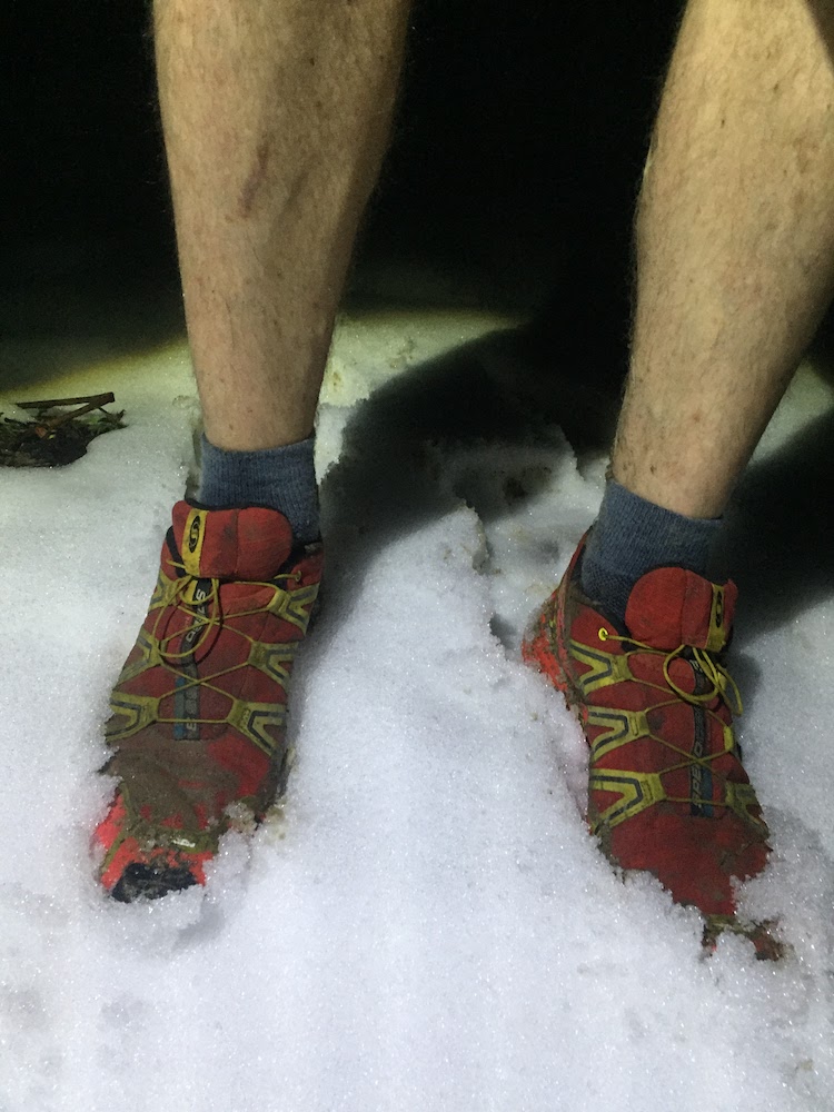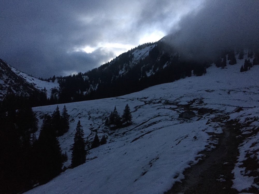 Ich setzte mich also um 17:30 Uhr in den Zug nach Garmisch, um gegen 20 Uhr Richtung Stepbergalm aufzubrechen, die ich nach etwa eineinhalb Stunden kurz vor Dunkelheit erreicht. Da dort auf gut 1600m Höhe schon ordentlich Schnee lag, entschloss ich mich kurzfristig, die Kreuzspitze, mit knapp 2200m Höhe der höchste Gipfel der Ammergauer Alpen, auszulassen, und stattdessen über Schloss Linderhof eine etwas niedrigere Variante zu wählen. Es folgte der zweite lange Anstieg zum Bäckenalmsattel. Auch dort lag wieder Schnee in Kombination mit ordentlich Matsch.