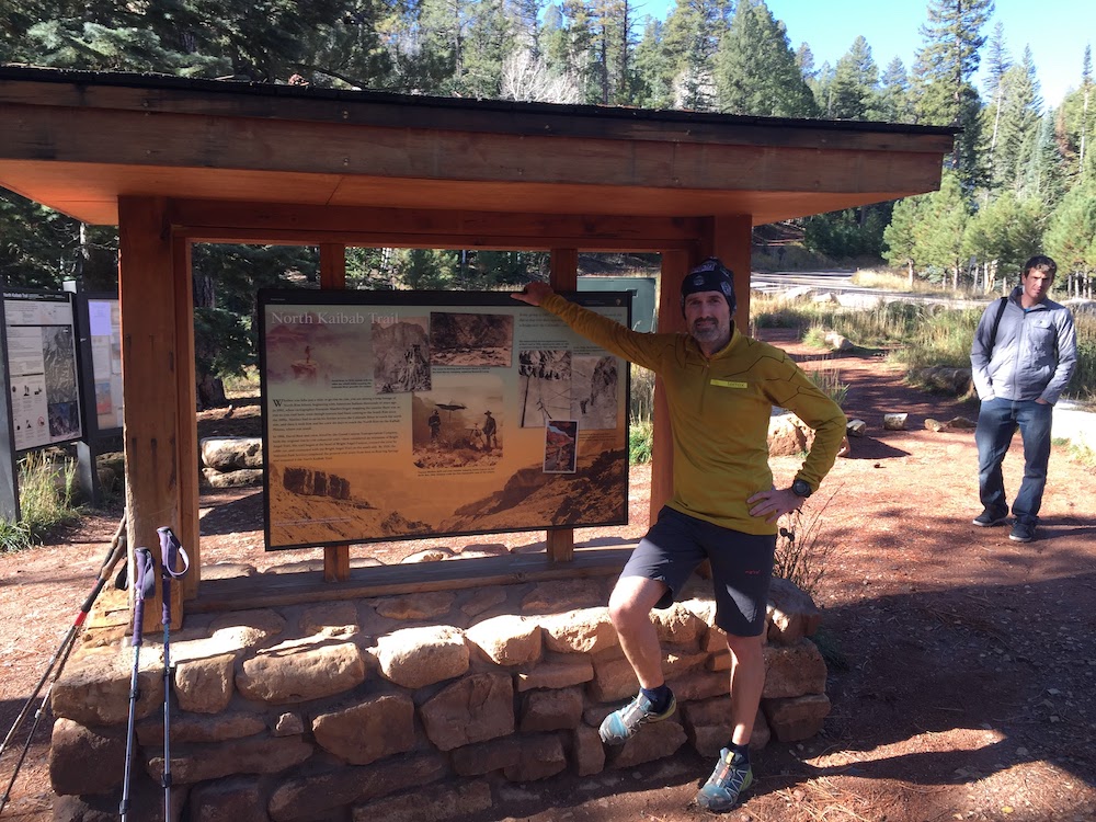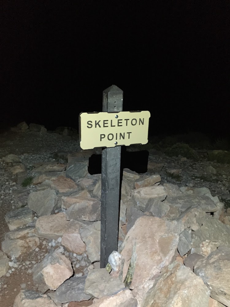 Doch das Zeitfenster, das mir zur Verfügung stand, war ziemlich knapp. Bis ich nach Konferenzende meinen Mietwagen abgeholt hatte und alles gepackt war, war es schon acht Uhr abends. Es folgten 4,5 Stunden langweiliges Highway-Cruisen, ehe ich in Grand Canyon Village um 1:30 Uhr in der Nacht ankam. Nach zwei Stunden Schlaf im Auto gab es zum „Frühstück“ einen ersten Cliffbar. Die Temperaturen waren inzwischen auf knapp über null Grad gesunken, so dass ich erst mal fast alle Laufklamotten anzog, die ich dabei hatte. Mein Auto hatte ich zwischen den beiden möglichen Trailheads der Südseite, von denen jeweils ein Weg hinunter zum Colorado führt, geparkt. So musste ich erst mal knapp vier Kilometer auf dem asphaltierten (und bei Tag extrem aussichtsreichen) Rim-Trail bis zum South-Kaibab Trailhead laufen.