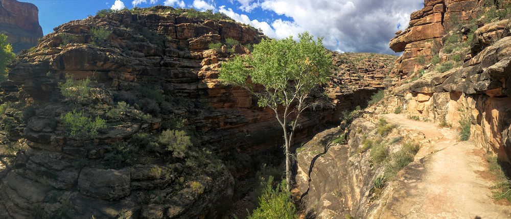 An der Phantom Ranch legte ich dieses Mal eine kurze Rast ein, ehe ich den finalen Anstieg in Angriff nahm. Nochmals etwa 1300 Höhenmeter auf knapp 16 km Länge. Laufen war nun nicht mehr drin. Nach 60 Km konnte ich aber zumindest die Wanderer flott marschierend überholen, von denen sich einige ganz schön hoch quälen mussten und von der atemberaubenden Landschaft wohl nicht mehr viel mitbekommen haben.