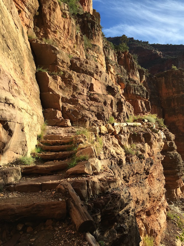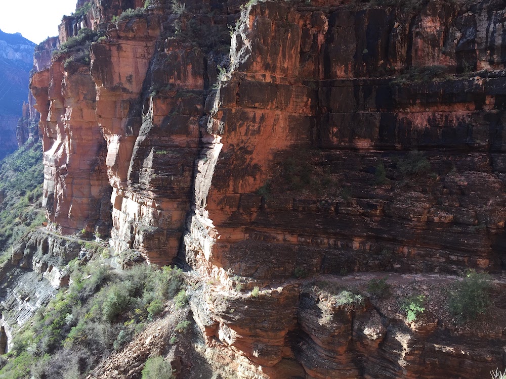 Auf dem Bright Angel Campground und der Phantom Ranch herrschte bereits reges Treiben. Da ich komplett auf Selbstversorgung eingestellt war (ausgenommen Wasser), lief ich sofort weiter und nahm den fast 23 Kilometer langen und mit 1700 Höhenmetern gespickten North-Trail in Angriff. Nach einer weiteren Stunde begann es zu dämmern und ich konnte zum ersten mal die atemberaubende Landschaft bewundern. Verrückt! Vor wenigen Stunden noch im surrealen Las Vegas und nun mitten im Trailrunner’s Paradise!