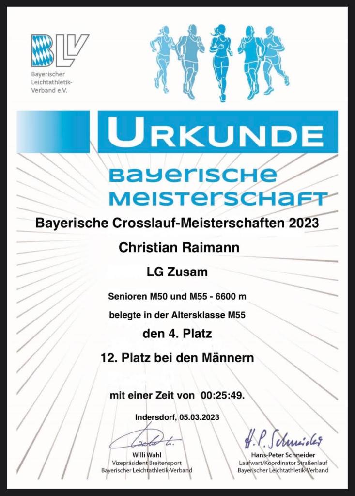 Seit einiger Zeit hatte ich bereits im Hinterkopf, mal an einem Cross-Rennen teilzunehmen. Nachdem ich inzwischen im Rahmen meiner Mitgliedschaft bei der LG Zusam auch einen entsprechenden BLV-Startpass besitze, konnte ich diesen Wunsch endlich in die Tat umsetzen und meldete mich für die Bayerische Crosslauf-Meisterschaft in Markt Indersdorf.