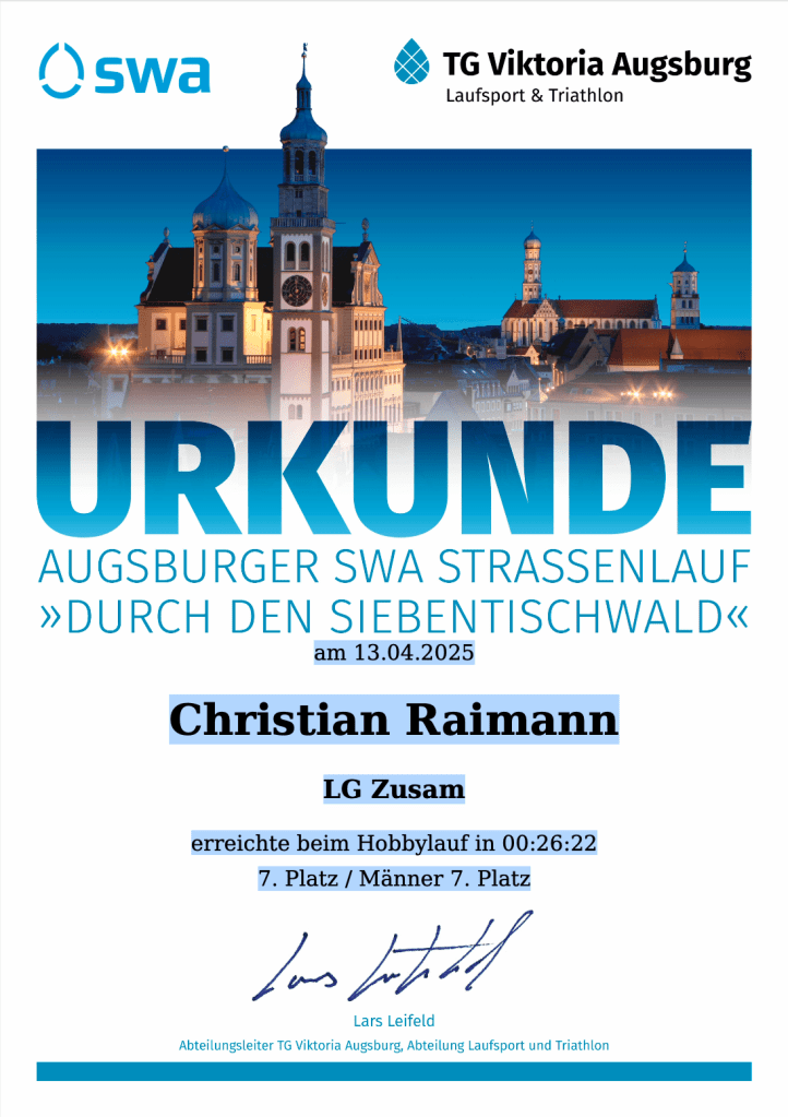 Zwei Wochen später wollte ich eigentlich im Rahmen des swa Straßenlaufs um die Schwäbische Meisterschaft im Halbmarathon mitkämpfen. Aufgrund der unzureichenden Vorbereitung entschied ich mich aber, nur die 6,7 km Strecke zu absolvieren.