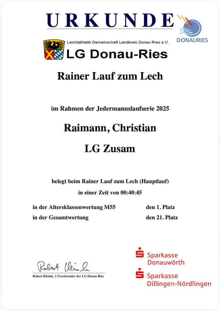 Auf leicht veränderter Strecke startete 2025 die Jedermannslaufserie wieder in Rain. Bei strahlendem Sonnenschein, aber aufgrund des böigen Winds frischen Temperaturen, gingen knapp 400 Läuferinnen und Läufer auf die gut zehn Kilometer lange Hauptstrecke.