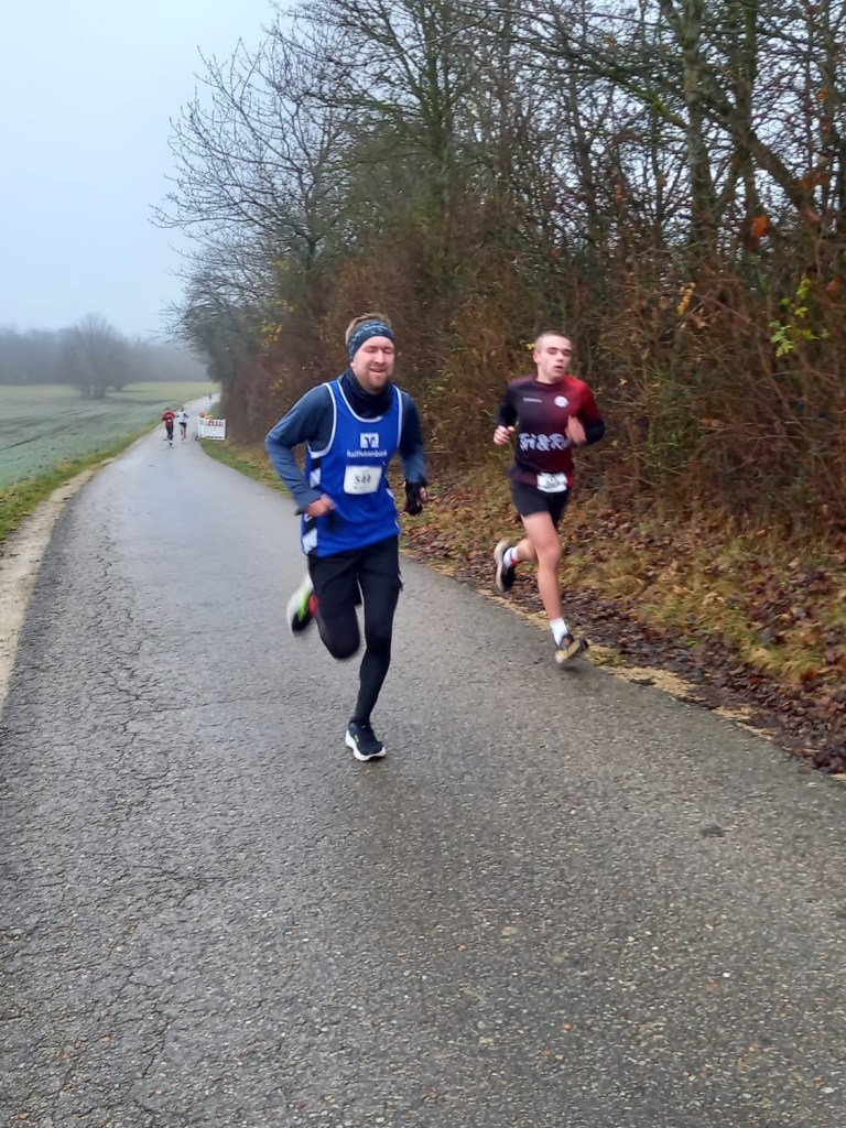 Bei typischen JML Bedingungen (Temperatur knapp über dem Gefrierpunkt und trüb) wurde gleich vom Start weg die ersten 1,5 km überwiegend bergab richtig los geballert. Ich pendelte mich so ca. 20 bis 50 Meter hinter Simon ein, war aber schon ab Kilometer drei im roten Bereich, um nicht weiter reißen lassen zu müssen. Kurz dachte ich, das würde wohl nichts werden, doch ab etwa der Hälfte der Strecke konnte ich mich unerwarteterweise nochmals ran kämpfen. Das verlieh wohl im wahrsten Sinne des Wortes Flügel. Nachdem wir kurz gleichauf waren, übernahm ich die (AK-)Führung und verteidigte diese – mit viel Kampf – bis ins Ziel. Somit konnte ich nach 2023 und 2024 das M55-Gesamtsieg-Triple perfekt machen!